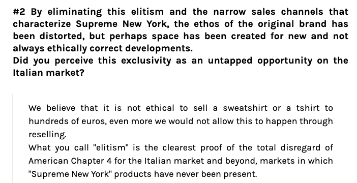 可能大家看了上面这个箱子会觉得IBF有点不要脸,但是更不要脸的还在后面。同样是2018年在Nss Magazine的采访中,当被问到如何看待外界觉得Supreme Italia是抄袭时,IBF回答道: